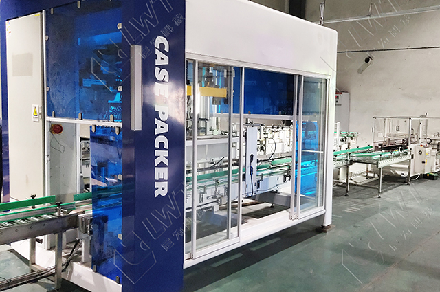 進(jìn)瓶輸送線用于提供瓶子,罐子或其它待裝箱的物料輸送。進(jìn)箱輸送線用于提供空箱,以便于裝箱機(jī)將物品裝入其中。吸瓶部件用于將物料抓取并放入紙箱的步驟。